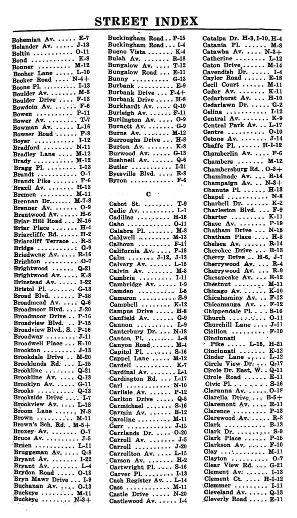 Street directory from a 1945 AAA map of Dayton, Ohio, and environs. Read more about this map and see its cover pages on the index page.