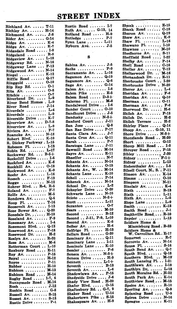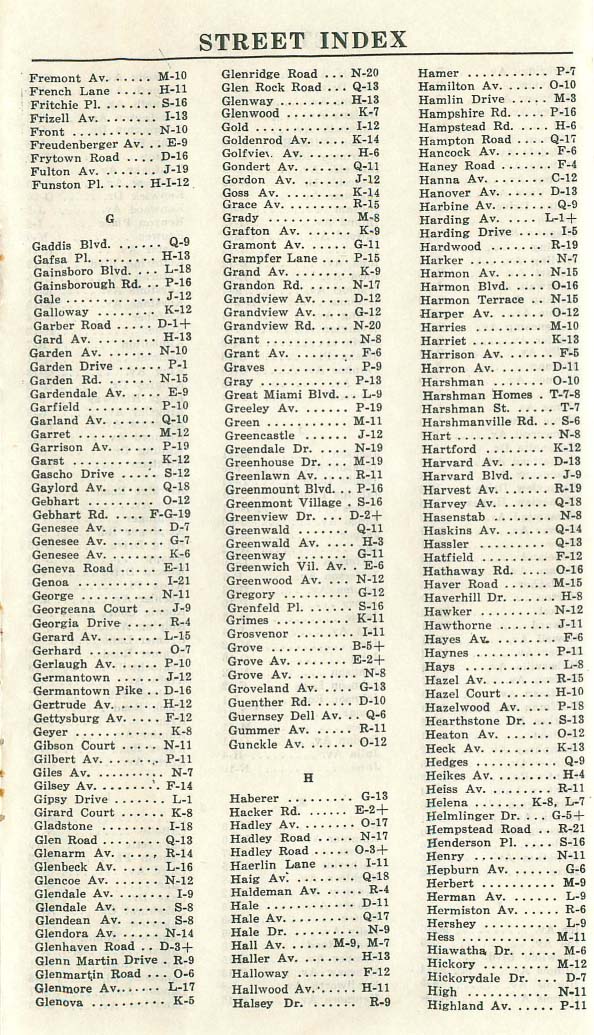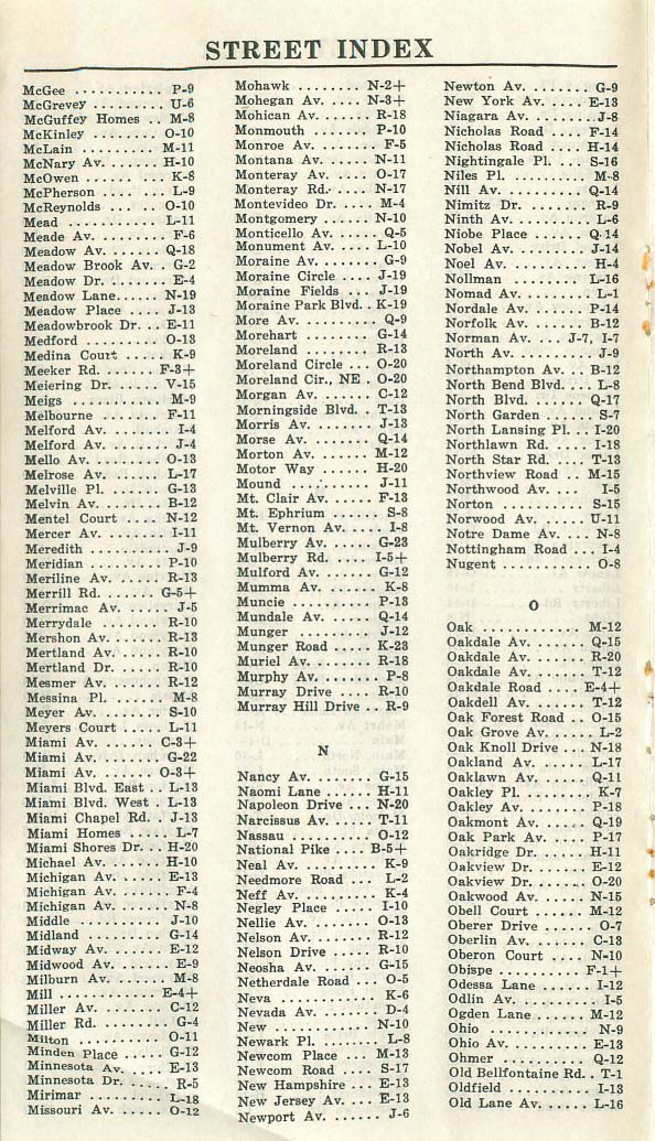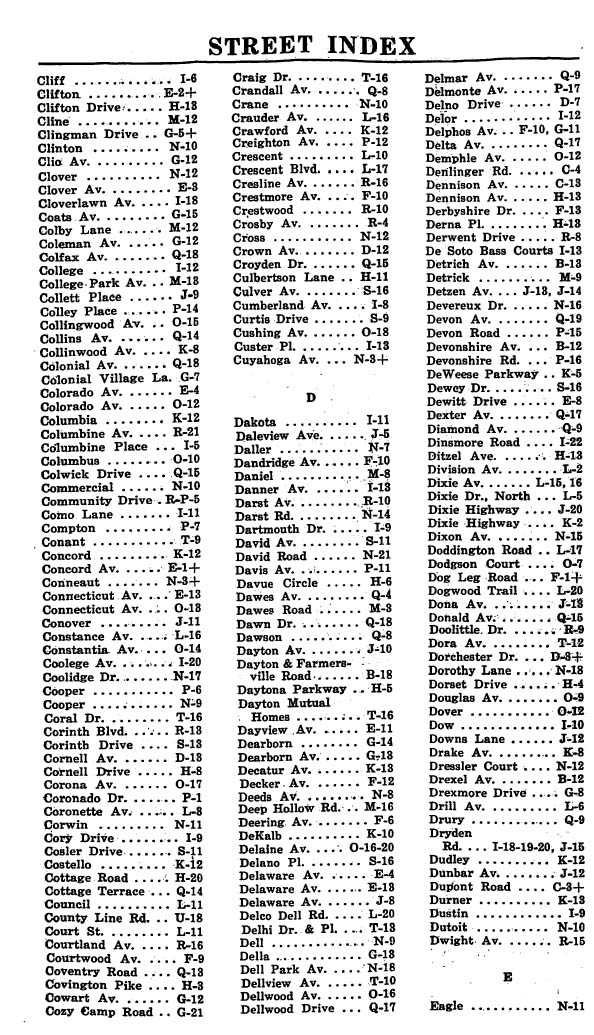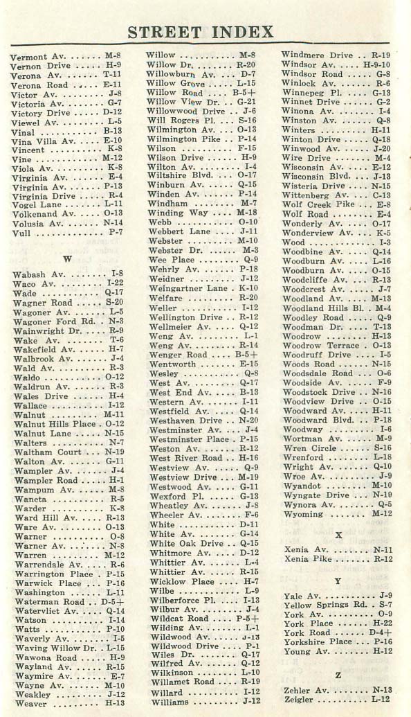 Street directory from a 1945 AAA map of Dayton, Ohio, and environs. Read more about this map and see its cover pages on the index page.