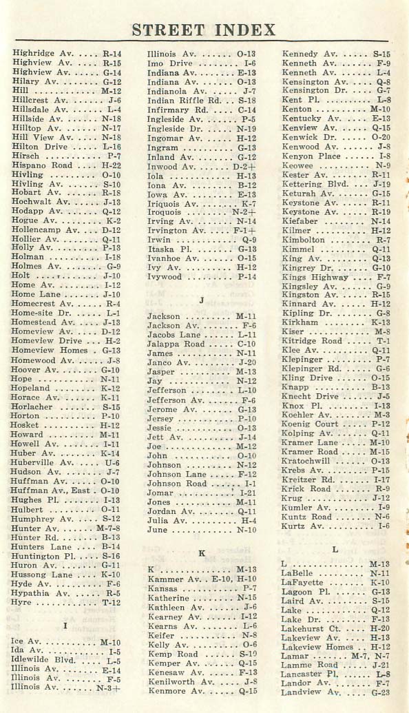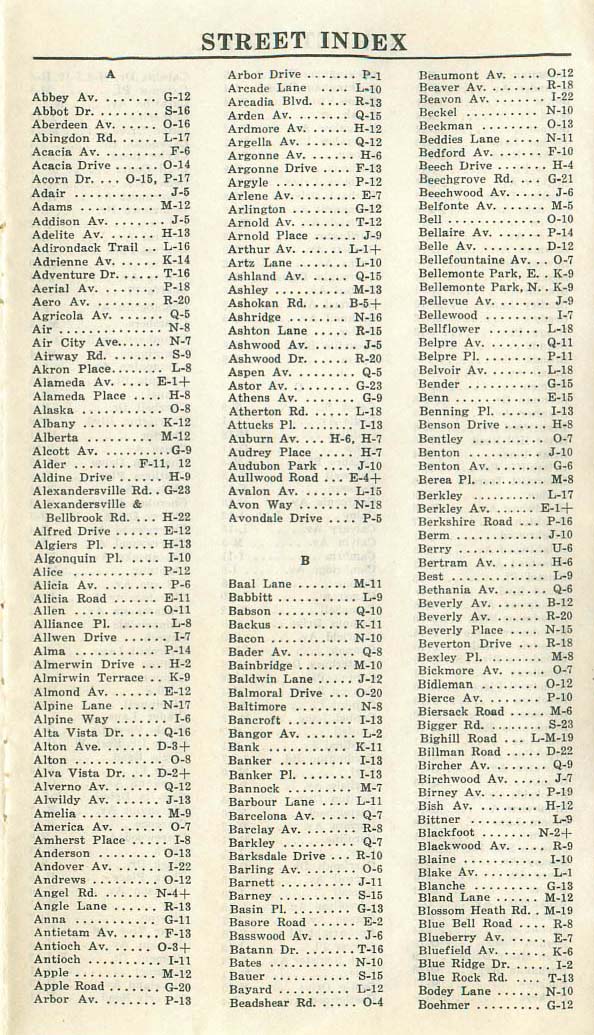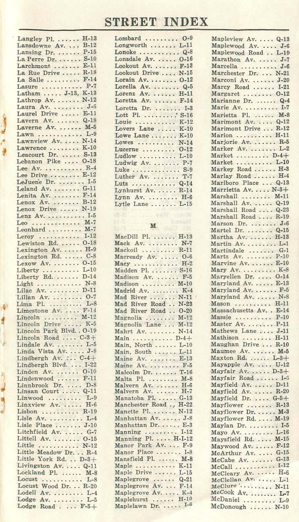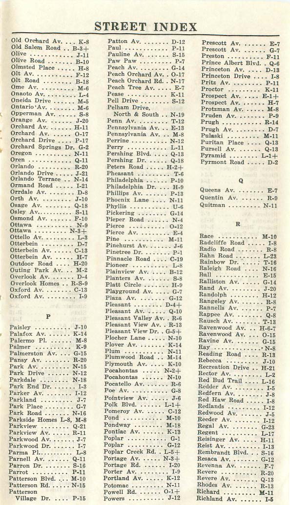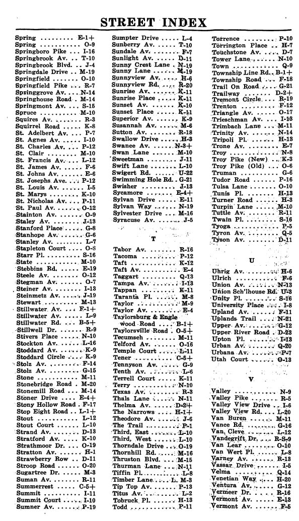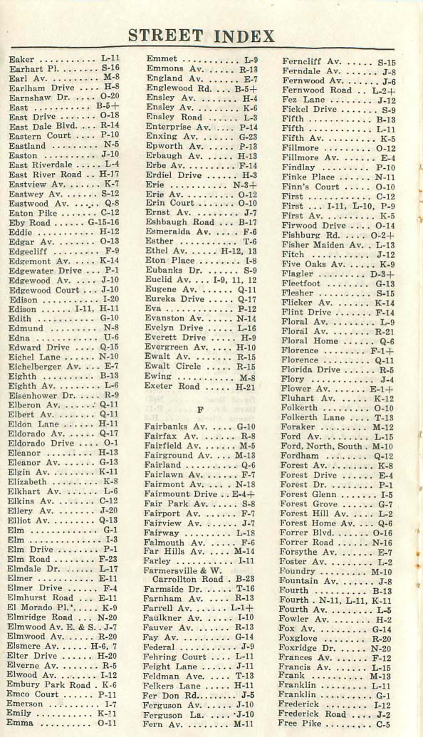 Street directory from a 1945 AAA map of Dayton, Ohio, and environs. Read more about this map and see its cover pages on the index page.